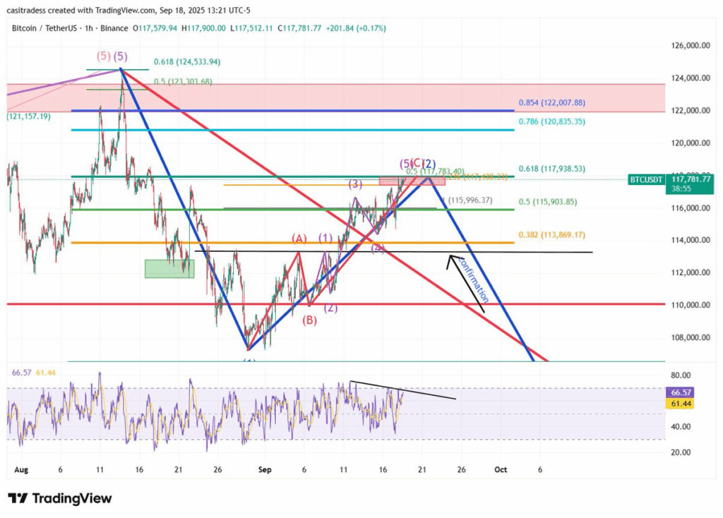 به گفته تحلیلگر بازار، کیسیتریدز (CasiTrades)، بیتکوین به سطح ۰.۶۱۸ فیبوناچی ریتریسمنت در محدوده ۱۱۷٬۹۰۰ دلار رسیده است. او این سطح را یک هدف تکنیکال برای چرخش بالقوه موج ۲ توصیف میکند.