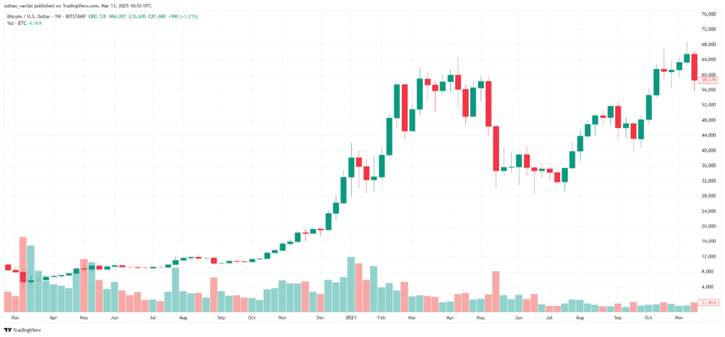 نمونه مشابه در سال ۲۰۲۰ رخ داد؛ زمانی که فدرال رزرو آمریکا برنامه خرید اوراق ۴ تریلیون دلاری خود را آغاز کرد. در آن دوره، قیمت بیتکوین طی ۲۰ ماه بیش از ۱,۰۵۰ درصد رشد کرد و از ۶,۰۰۰ دلار به ۶۹,۰۰۰ دلار رسید.